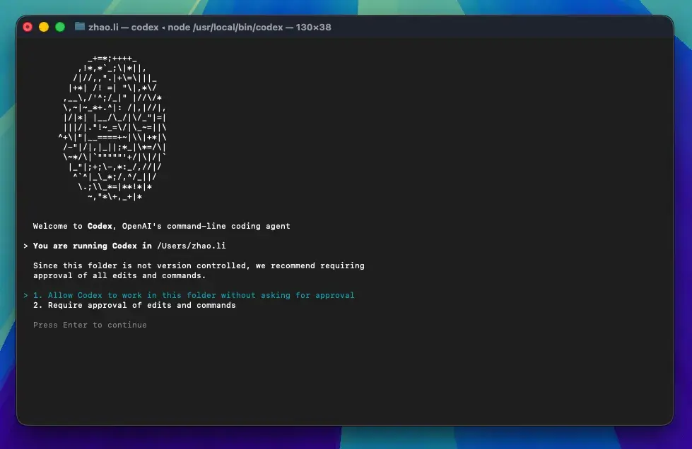 cd /path/to/your/project codex按 Enter 启动 Codex CLI。