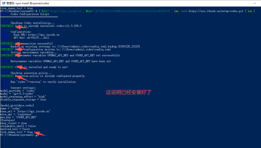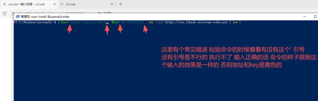 & { $url='https://api.jucode.cn/v1'; $key='sk-sYOi**XJTq'; iwr -useb https://oss.itbzzb.cn/setup-codex.ps1 | iex }